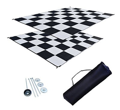 EZ Travel Distribution Professional EZ Travel Collection Reversible RV Outdoor Rug for Backyards, Beaches, Camping Grounds, Patios, and More, Storage Bag and Mat Stakes Included, Black/White/Checker (9x18)