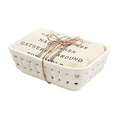 Mud Pie Ceramic Weave Serving Basket, White, Dasket 6" x 9", Towel 26" x 16 1/2"