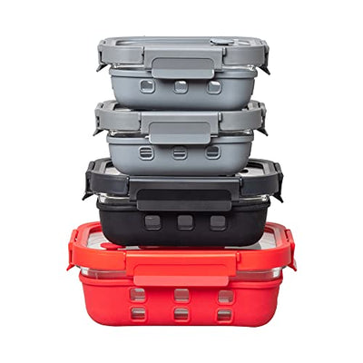 GENICOOK Borosilicate Glass Meal and Food Storage Containers with Silicone Wrap, Vent and Pro Grade Removeable Lockdown Levers, Square Shape - 8 pc Set (4 Containers - 4 Matching Lids)