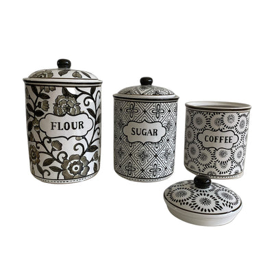 Drew Derose Coffee Flour Sugar Grey and White Floral 11, 9, and 7 inch Ceramic Kitchen Jar Canisters Set of 3